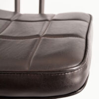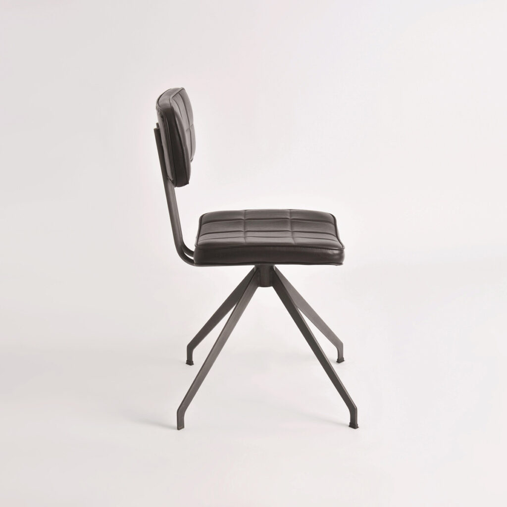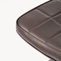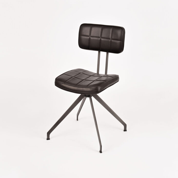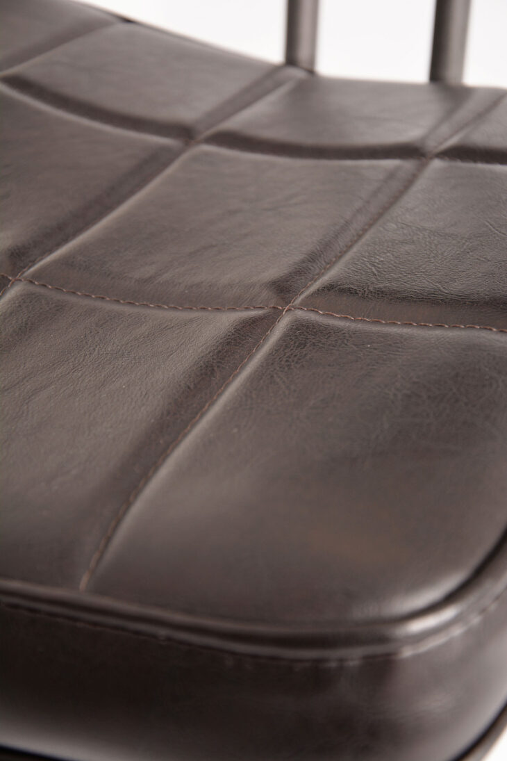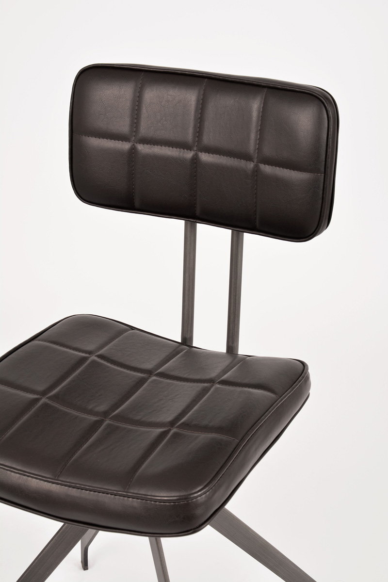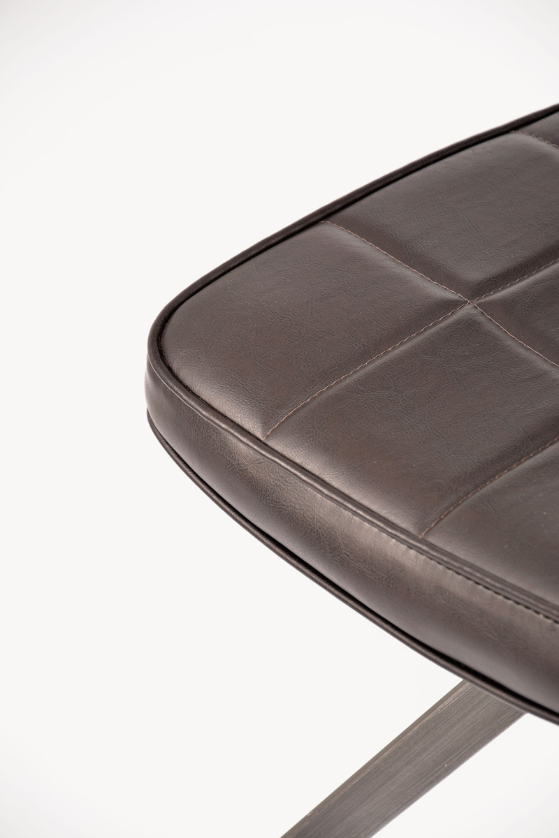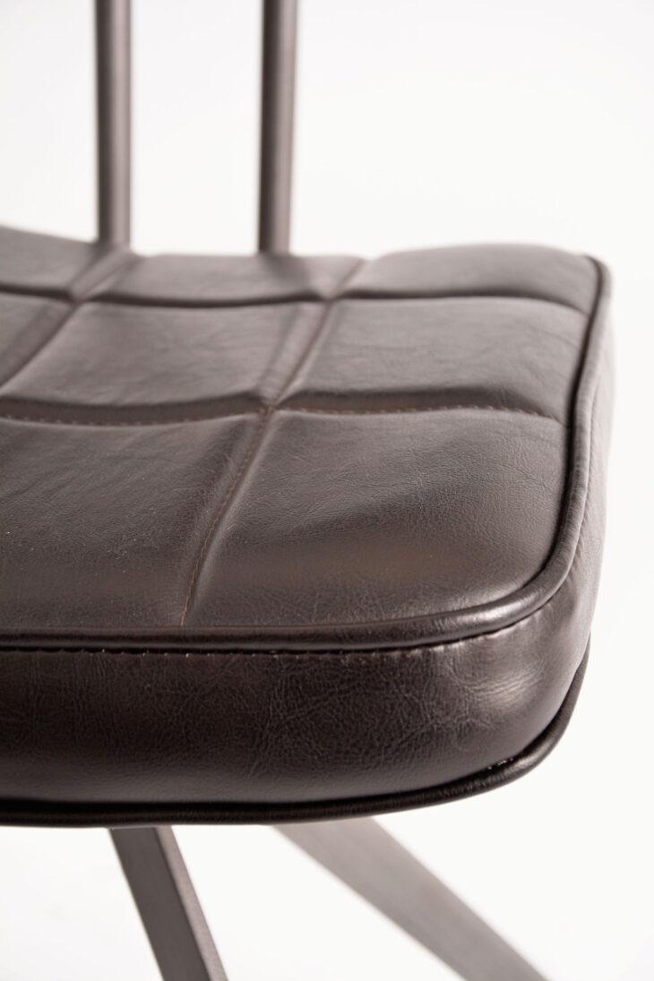 Stylowe krzesło Ashton to połączenie industrialnej elegancji i ponadczasowego komfortu. Wyróżnia się smukłą metalową konstrukcją o geometrycznej podstawie, która nadaje mu stabilności i charakteru. Tapicerowane siedzisko oraz oparcie pokryte zostały wysokiej jakości ekoskórą w ciemnobrązowym odcieniu, ozdobioną subtelnym pikowaniem w kratę. Całość dopełnia lekko zaokrąglona linia, która nadaje meblowi miękkości i zapewnia wygodę użytkowania.