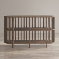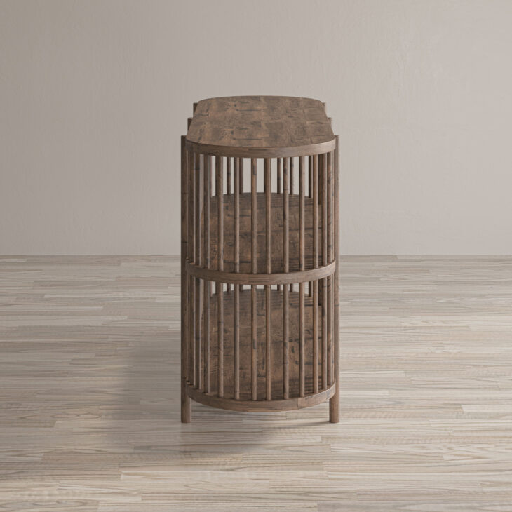 Delikatnie zaokrąglony blat oraz solidna, ale smukła forma sprawiają, że komoda nie przytłacza aranżacji, lecz ją harmonijnie uzupełnia. Dwie przestronne półki za łukowato zamkniętymi frontami pomieszczą zarówno przedmioty codziennego użytku, jak i dekoracje, a przemyślana konstrukcja ułatwia utrzymanie porządku.
