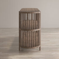 Delikatnie zaokrąglony blat oraz solidna, ale smukła forma sprawiają, że komoda nie przytłacza aranżacji, lecz ją harmonijnie uzupełnia. Dwie przestronne półki za łukowato zamkniętymi frontami pomieszczą zarówno przedmioty codziennego użytku, jak i dekoracje, a przemyślana konstrukcja ułatwia utrzymanie porządku.
