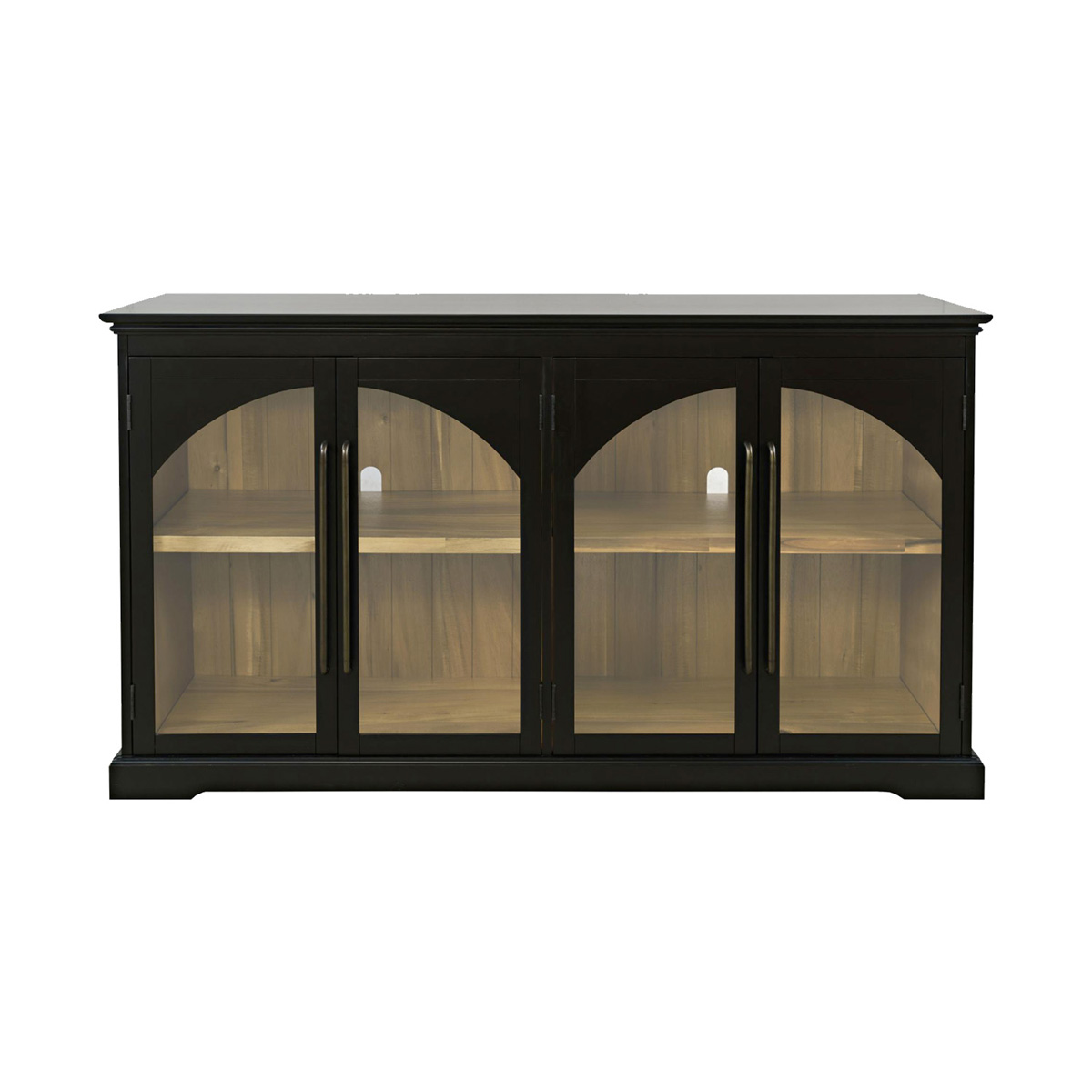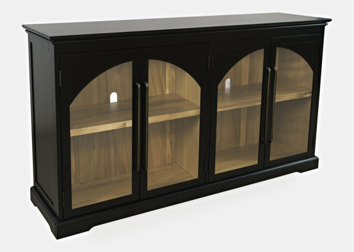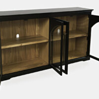 Komoda Avola w kolorze głębokiej czerni to mebel, który łączy ponadczasową elegancję z nowoczesną funkcjonalnością. Prosta forma została przełamana subtelnymi frezowaniami i detalami, które nadają bryle lekkości oraz wyrafinowania. 4 przeszklonych drzwi z dekoracyjnym łukiem oraz metalowe, podłużne uchwyty tworzą harmonijną całość, idealnie wpisującą się zarówno w klasyczne, jak i współczesne aranżacje. Czarne wykończenie kontrastuje z naturalnym wnętrzem z fornirowanego drewna, eksponując jego strukturę i ciepły odcień.