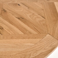 Okrągły stół z kolekcji Indus to doskonałe połączenie industrialnej estetyki z naturalnym pięknem litego drewna. Blat o średnicy 125 cm wykonany z białego dębu prezentuje się niezwykle efektownie dzięki wyraźnej strukturze drewna oraz intarsji w kształcie litery „X”, która nadaje mu wyjątkowy, rzemieślniczy charakter. Całość wsparta jest na solidnym stalowym stelażu w kolorze ciemnografitowym, którego podstawa również przybiera formę litery „X”, tworząc harmonijną i nowoczesną bryłę.