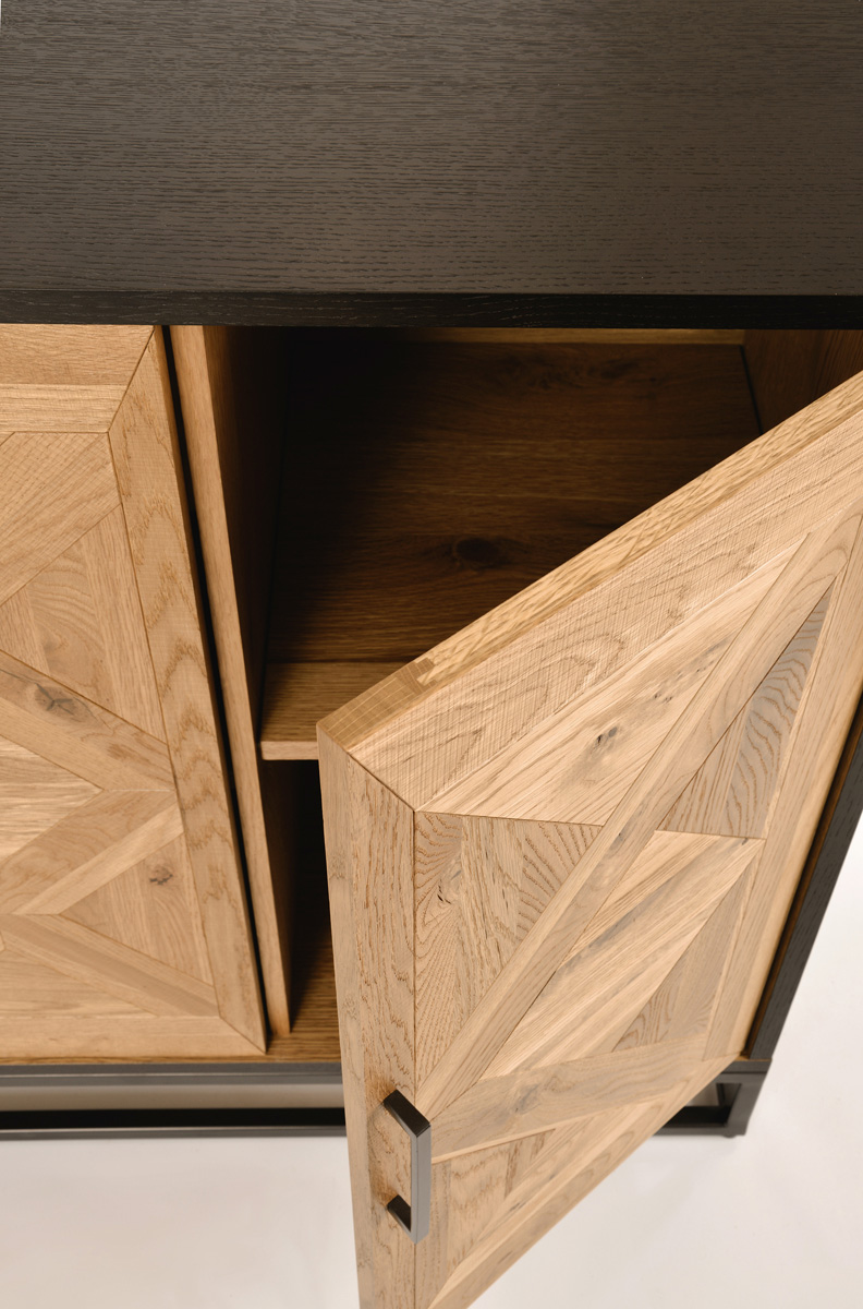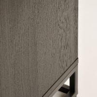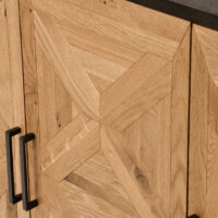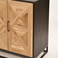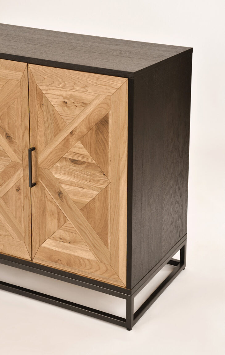 Komoda Indus to wyjątkowy mebel w stylu loftowym, który łączy w sobie surowość metalu z ciepłem naturalnego drewna. Osadzona na solidnej stalowej podstawie w kolorze ciemnego grafitu, z czarnym korpusem i efektownymi frontami wykonanymi z litego białego dębu. Intarsja w kształcie litery X na drzwiczkach tworzy geometryczną, artystyczną kompozycję, która od razu przyciąga wzrok.