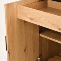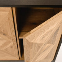 Komoda posiada trzy drzwi, za którymi ukryte są dwie pojemne półki oraz jedną praktyczną szufladę z prowadnicami soft-close, które zapewniają ciche i płynne domykanie. Mebel doskonale odnajdzie się w salonie, jadalni lub biurze jako elegancki akcent o wyrazistym charakterze. To idealna propozycja dla miłośników loftowego designu z naturalnymi akcentami.