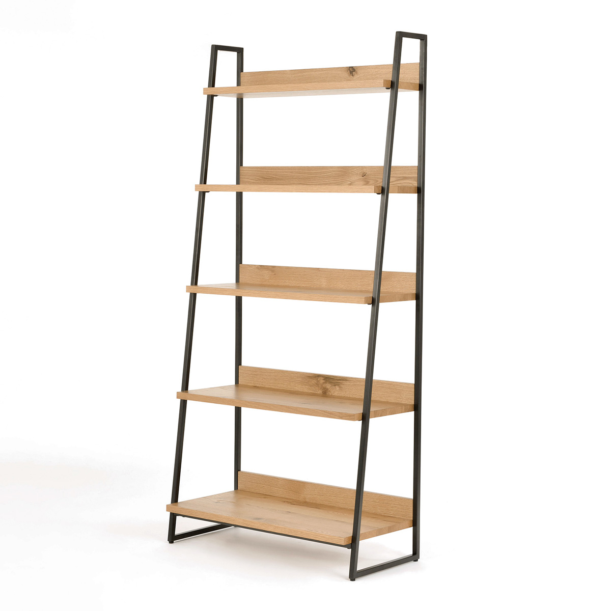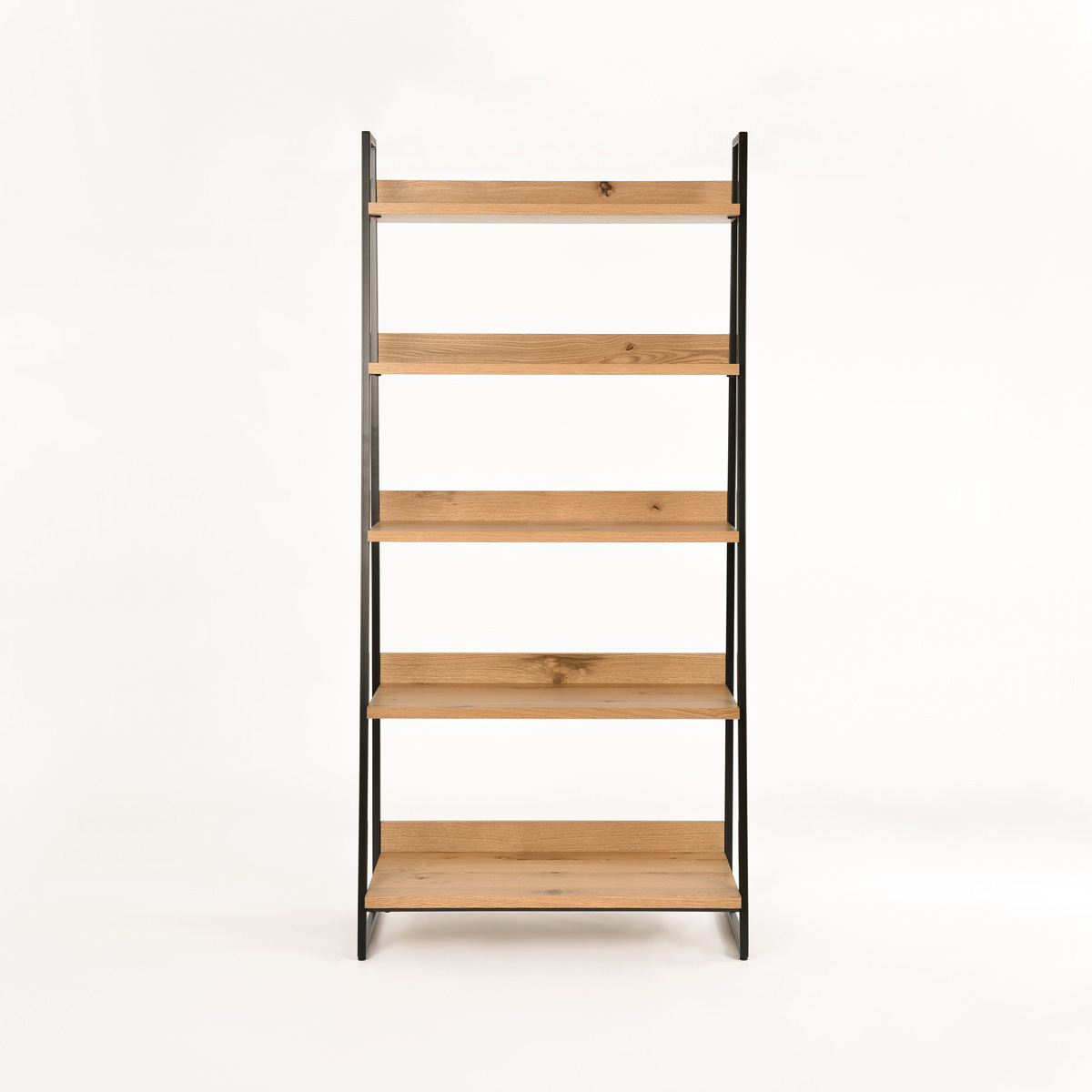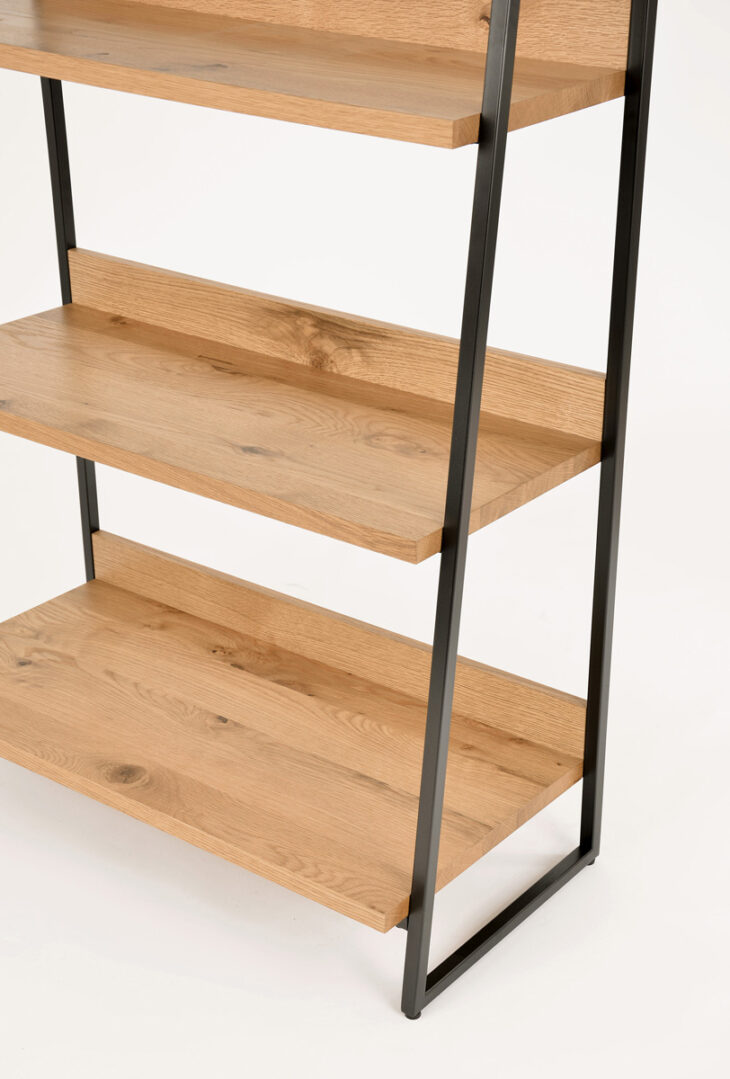 Regał Indus to esencja stylu industrialnego, stworzona z myślą o nowoczesnych, ale surowych wnętrzach. Osadzony na solidnej stalowej podstawie w kolorze ciemnego grafitu o trapezowym kształcie, przyciąga uwagę swoją geometryczną, stabilną formą. Półki wykonane z litego drewna białego dębu zachwycają naturalnym rysunkiem słojów i jasną barwą, która ociepla całą konstrukcję.
