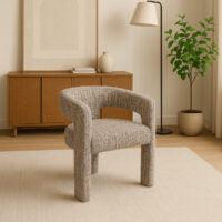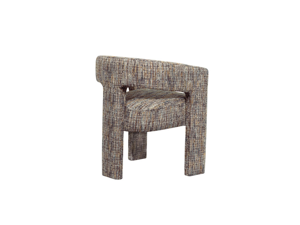 Nowoczesne krzesło Leith w kolorze melanż biały, czarny, niebieski, szary, beżowy, zachwyca subtelną formą i nietuzinkowym designem opartym na trzech nogach. Tapicerka z miękkiej, szenilowej tkaniny dodaje elegancji i komfortu, a obłe linie wprowadzają do wnętrza lekkość i harmonię.