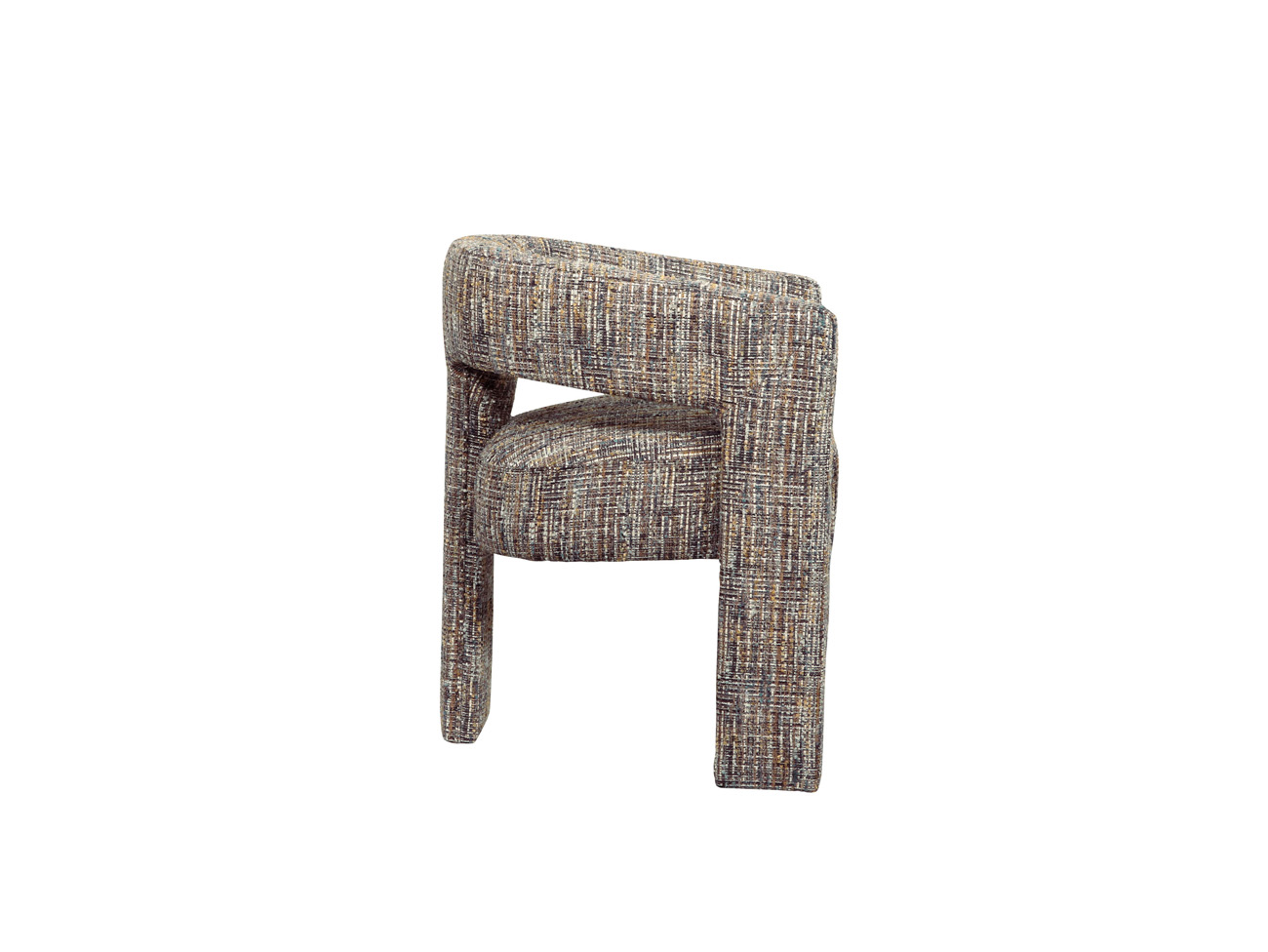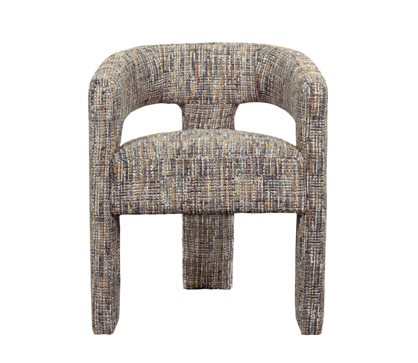Nowoczesne krzesło Leith w kolorze melanż biały, czarny, niebieski, szary, beżowy, zachwyca subtelną formą i nietuzinkowym designem opartym na trzech nogach. Tapicerka z miękkiej, szenilowej tkaniny dodaje elegancji i komfortu, a obłe linie wprowadzają do wnętrza lekkość i harmonię.