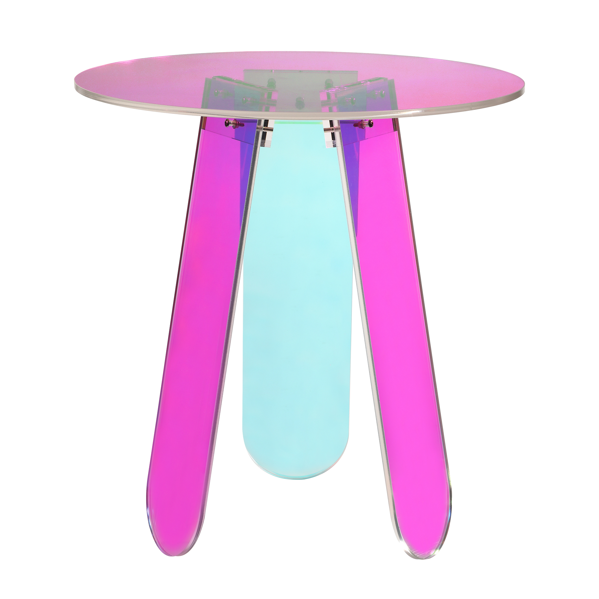 Nowoczesny stolik wykonany z przezroczystego, opalizującego akrylu, który zmienia swoje odcienie w zależności od kąta padania światła. Prosta forma, lekka konstrukcja i niepowtarzalny efekt wizualny sprawiają, że mebel ten doskonale odnajdzie się zarówno w przestrzeniach minimalistycznych, jak i bardziej wyrazistych aranżacjach.