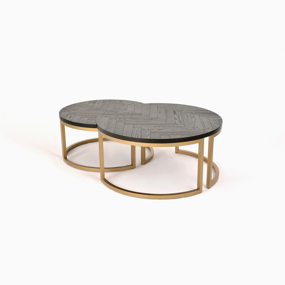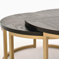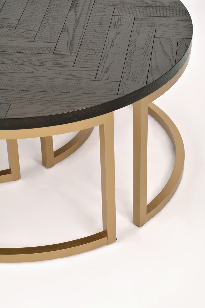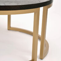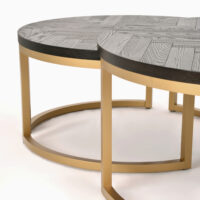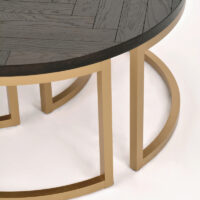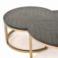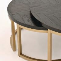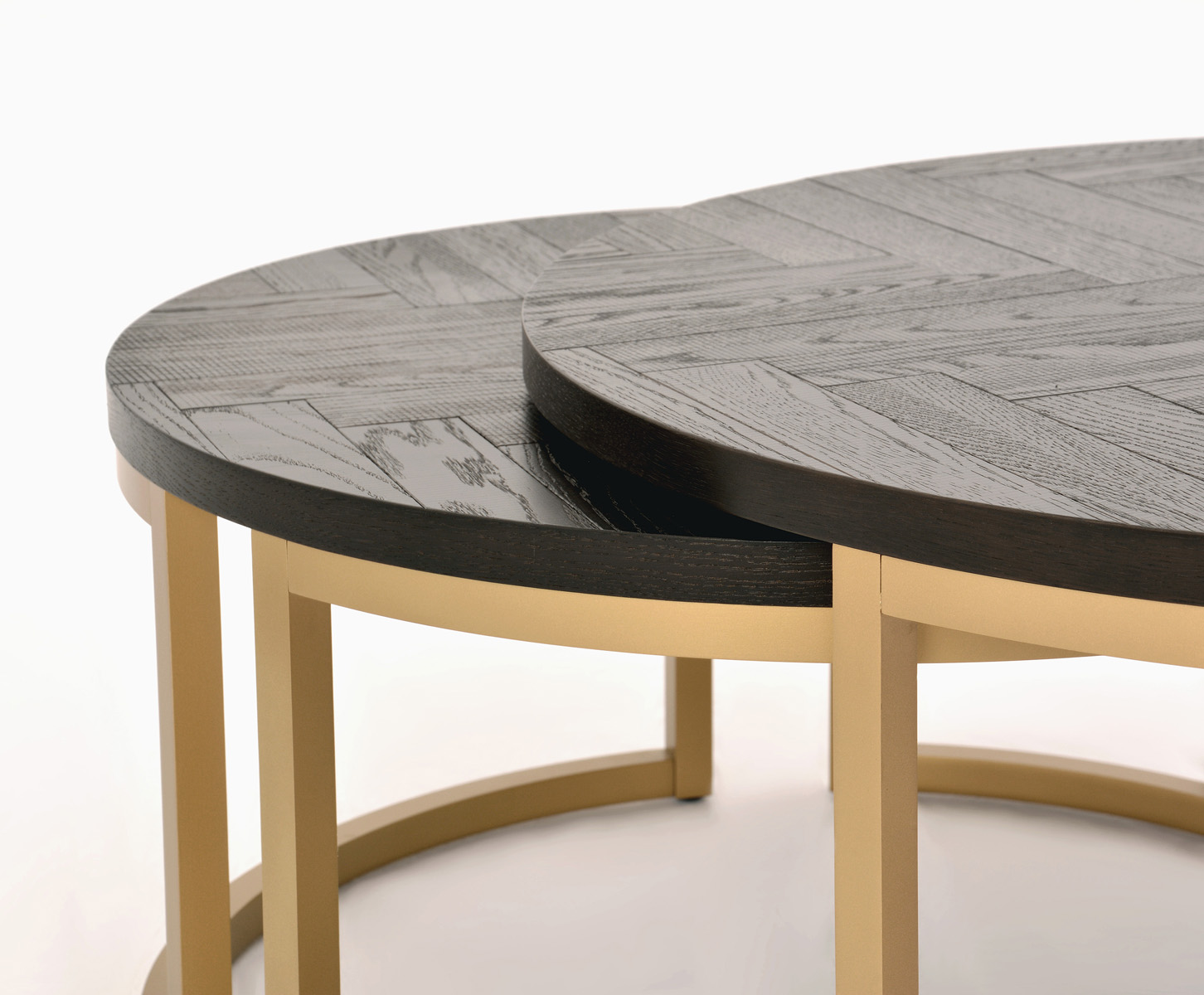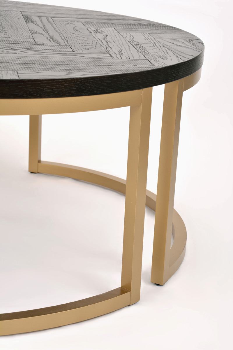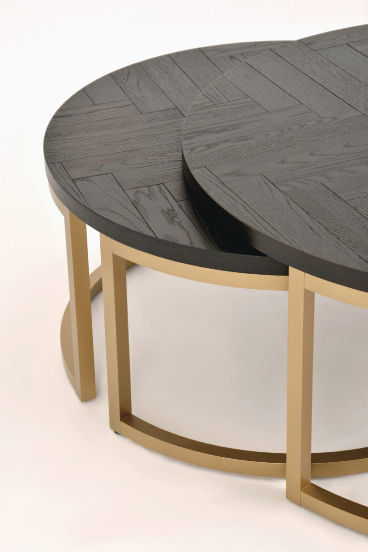 Solidne nogi w odcieniu mosiężnego złota o subtelnym półmacie wykonane są z litego drewna dębowego, co zapewnia trwałość, a jednocześnie wprowadza szlachetny kontrast do ciemnego blatu. Różnice w wysokości stolików (42 i 38 cm) pozwalają na funkcjonalne zestawienie ich razem lub rozmieszczenie w różnych częściach pomieszczenia.