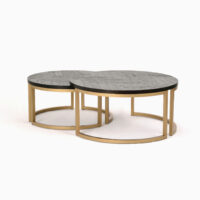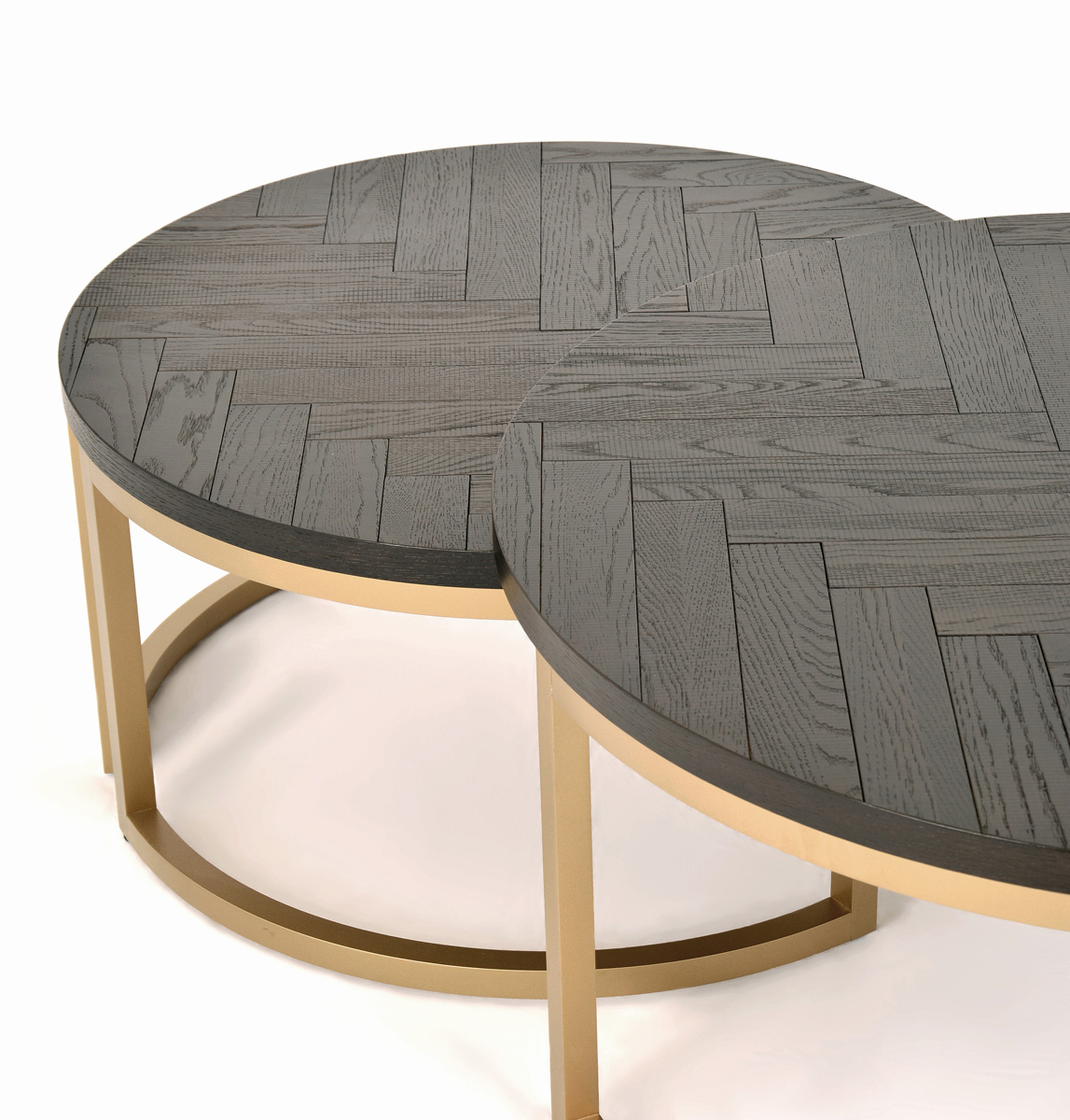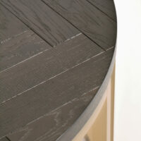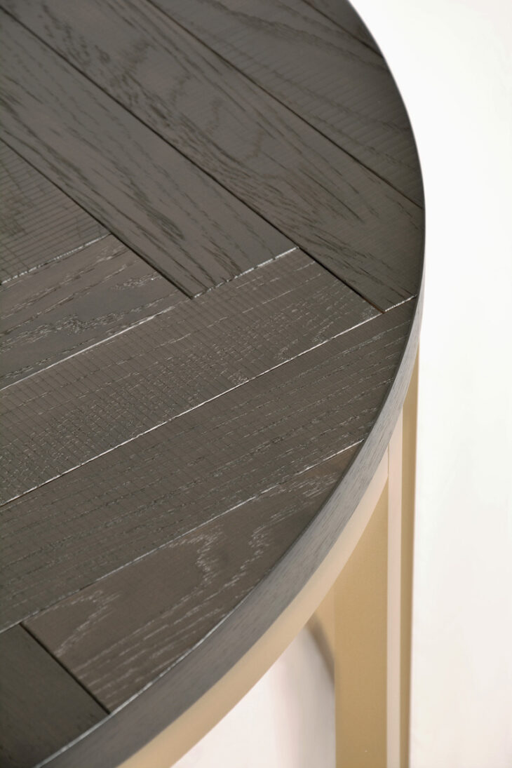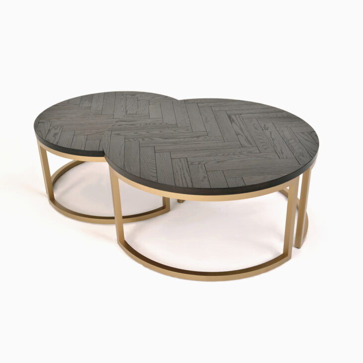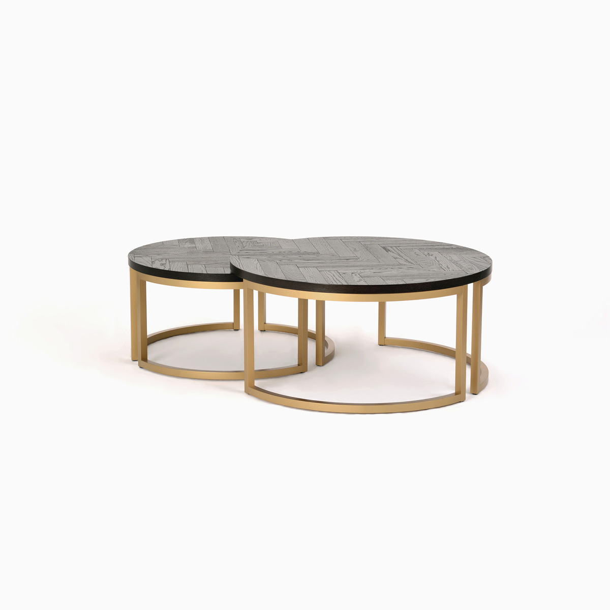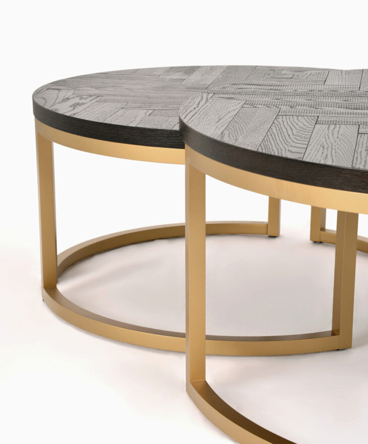 Solidne nogi w odcieniu mosiężnego złota o subtelnym półmacie wykonane są z litego drewna dębowego, co zapewnia trwałość, a jednocześnie wprowadza szlachetny kontrast do ciemnego blatu. Różnice w wysokości stolików (42 i 38 cm) pozwalają na funkcjonalne zestawienie ich razem lub rozmieszczenie w różnych częściach pomieszczenia.