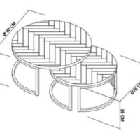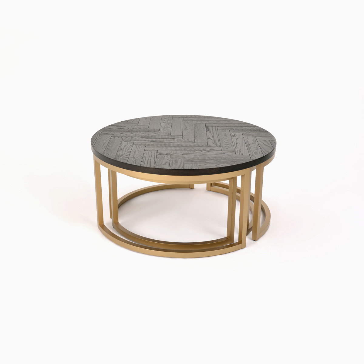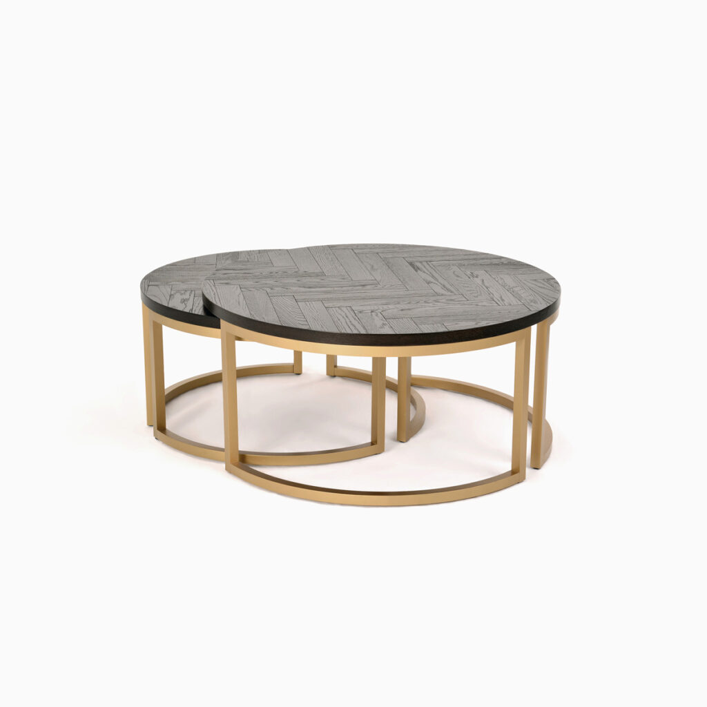 Zestaw stolików kawowych Seville to połączenie klasycznego wzornictwa z nowoczesnym wykończeniem, które idealnie wpisuje się w stylistykę retro, glamour oraz współczesnych wnętrz. Okrągłe blaty wykonane z drewna bukowego i MDF-u zdobi efektowna intarsja w jodełkę, pokryta czarnym lakierem w wysokim połysku. Dzięki temu powierzchnia nie tylko przyciąga wzrok, ale też pięknie odbija światło, dodając elegancji i głębi całej kompozycji.