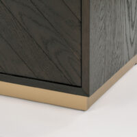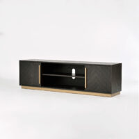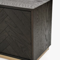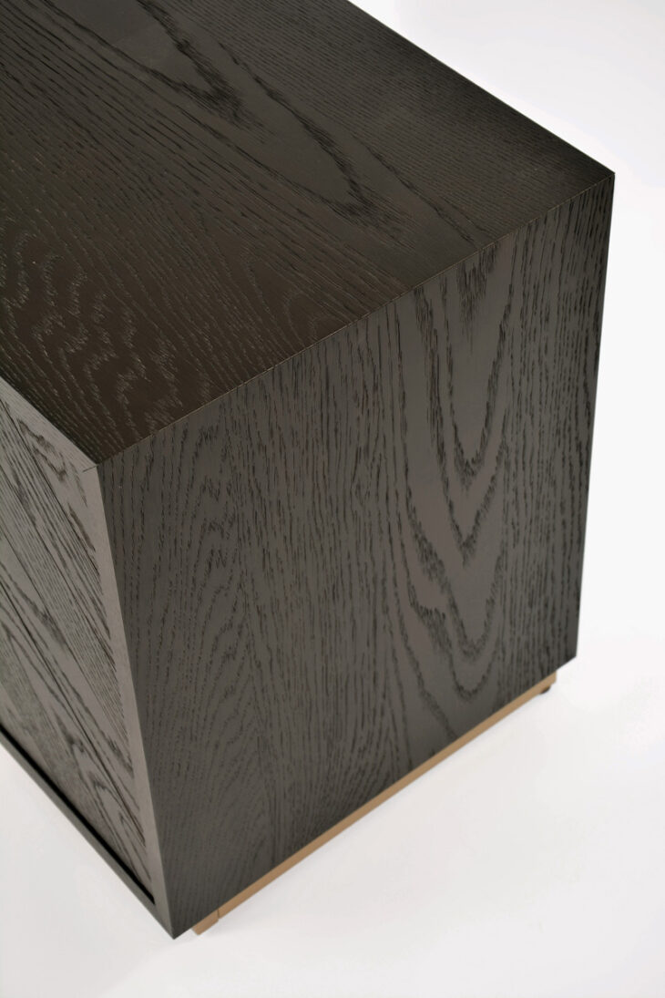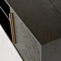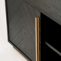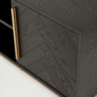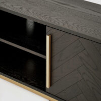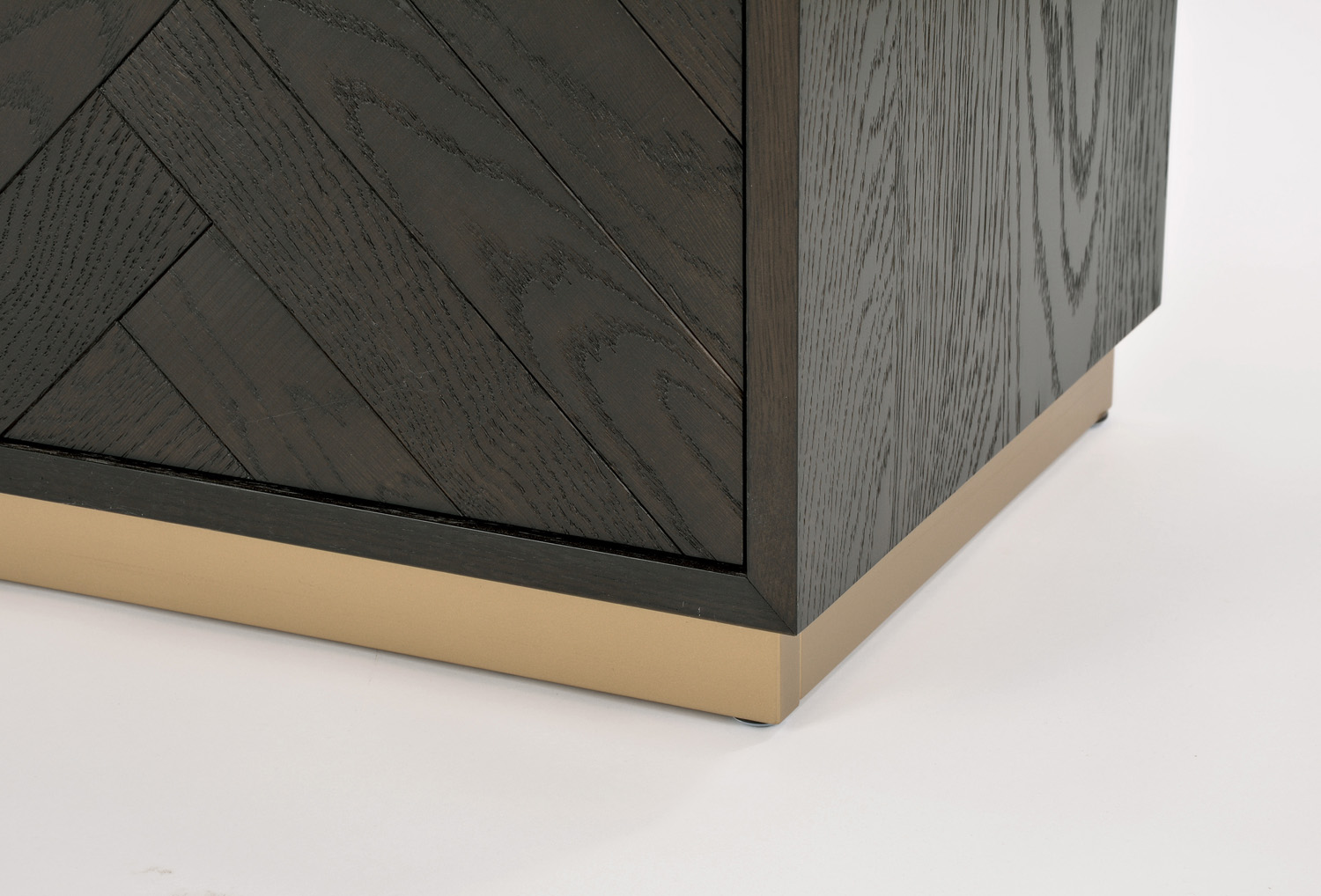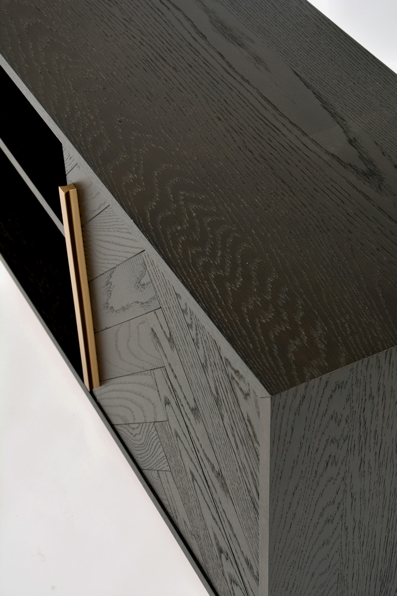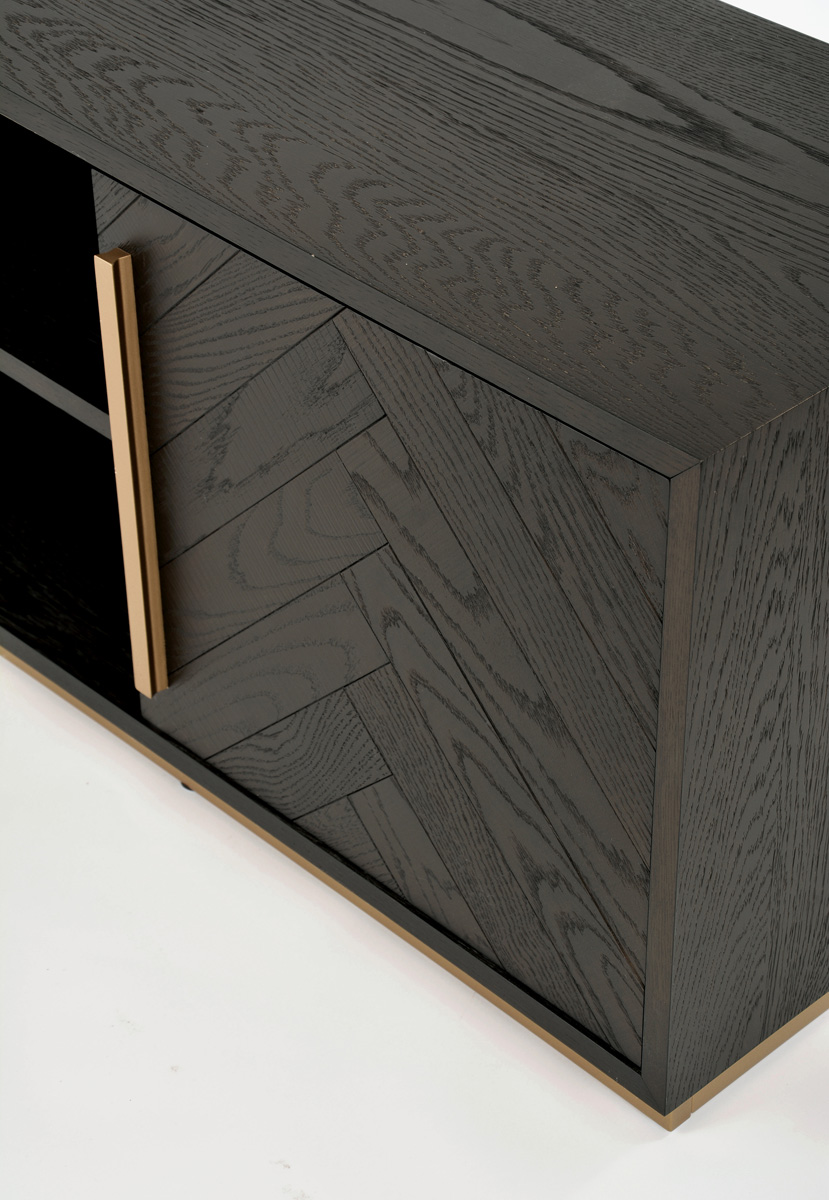 Seville to wyrafinowana komoda RTV, która łączy ponadczasową formę z luksusowym wykończeniem. Wykonana z drewna bukowego i dębowego oraz MDF, mebel odznacza się wysoką jakością i dbałością o detale. Czarny korpus o subtelnej strukturze drewna współgra z wyrazistymi frontami pokrytymi intarsją w jodełkę – elegancką i pełną głębi dzięki lakierowi w wysokim połysku.