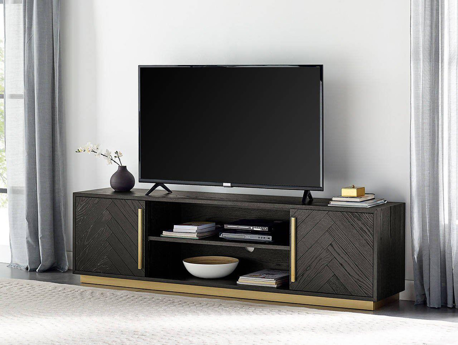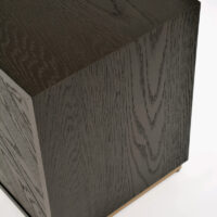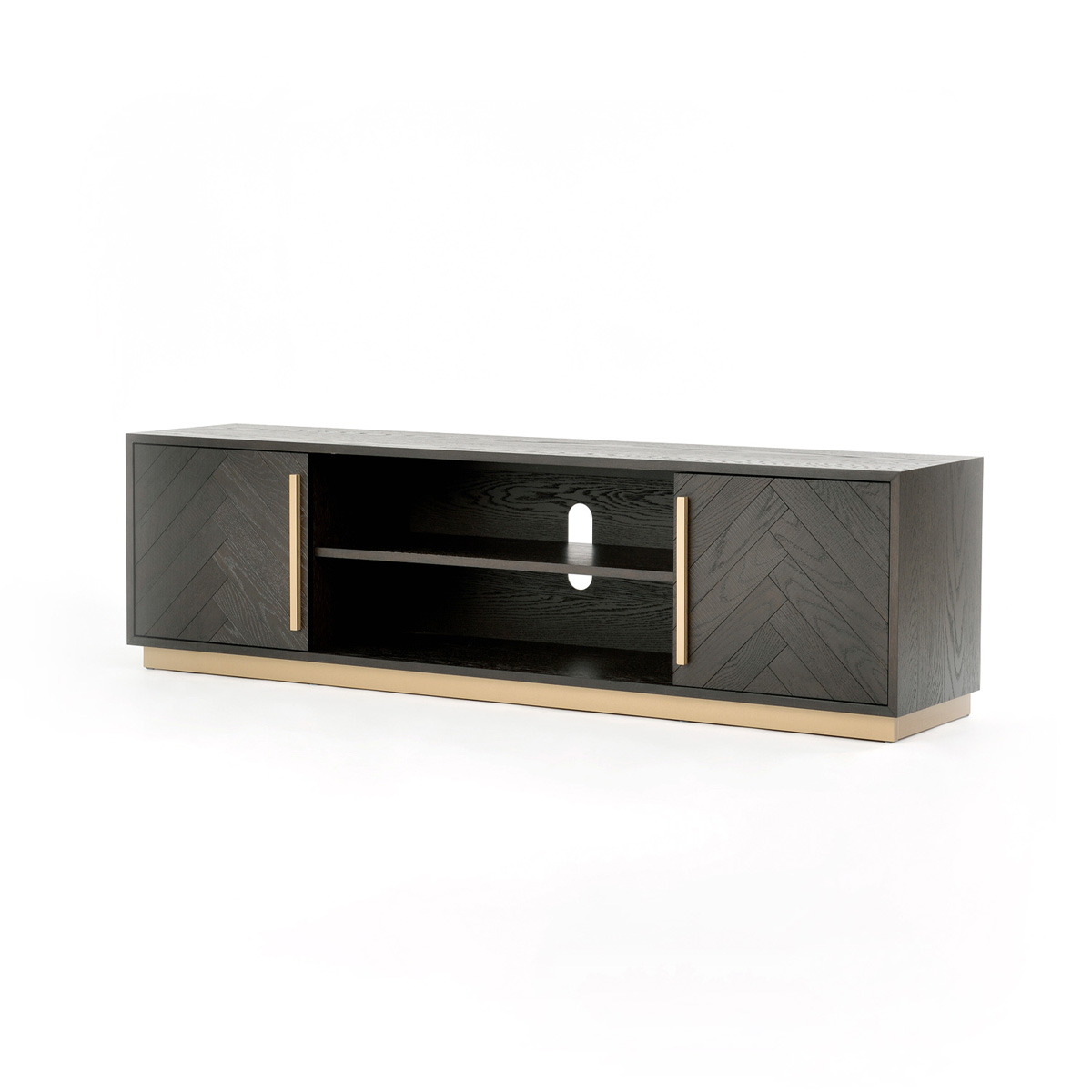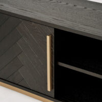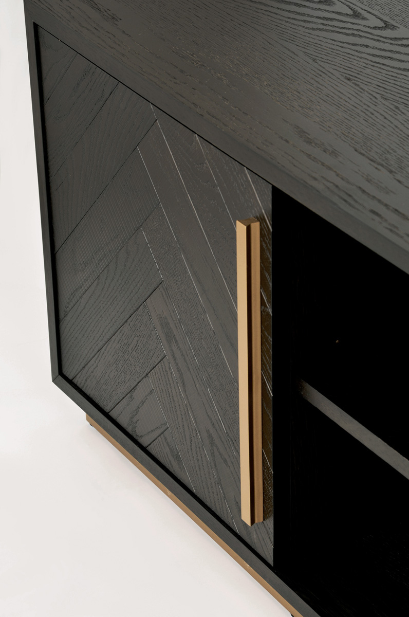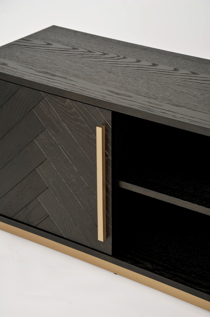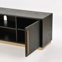 Złote uchwyty i cokół w odcieniu szlachetnego mosiądzu zostały wykonane z litego drewna dębowego i wykończone półmatem, co nadaje całości wyważony, nowoczesny akcent. Dwie pojemne szafki z jedną wspólną półką zapewniają praktyczną przestrzeń do przechowywania urządzeń multimedialnych, kabli i dodatków. Komoda nie wymaga montażu – wystarczy ją ustawić i korzystać od razu.