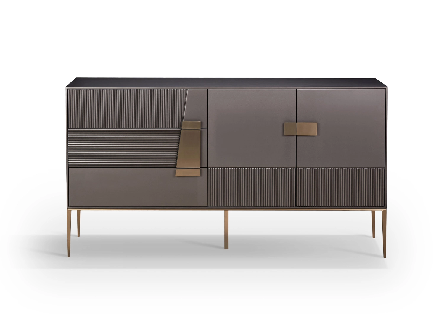 Stylowa komoda Stilig w kolorze ciemnego grafitu to połączenie minimalistycznego designu z dekoracyjnymi detalami. Gładkie fronty współgrają z asymetrycznymi ryflowaniami w pionie i poziomie, tworząc wyrazisty, a jednocześnie harmonijny efekt wizualny. Smukłe, złote nogi i geometryczne uchwyty dodają komodzie lekkości i luksusu.