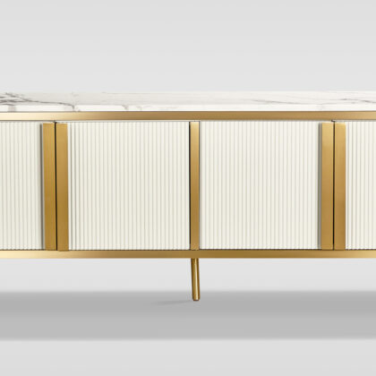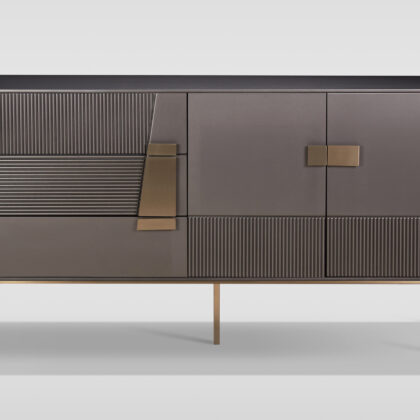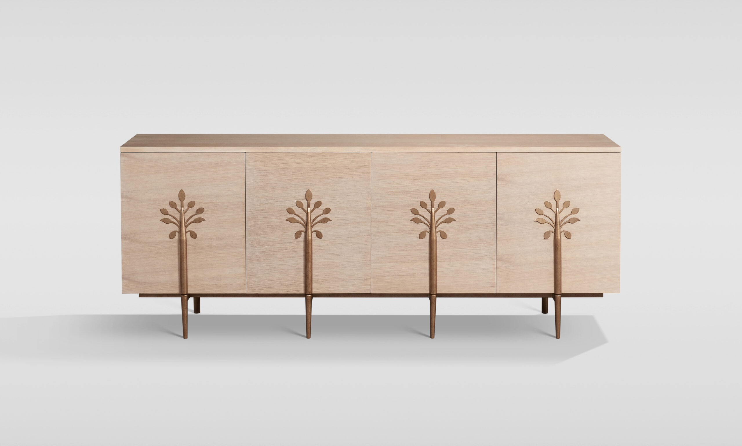 Komoda Stilig to wyjątkowy mebel, który łączy klasyczne inspiracje stylu Art Deco z nowoczesną funkcjonalnością. Jej prosta bryła wykonana z okleiny z białego dębu zyskała unikatowy charakter dzięki złotym akcentom i dekoracyjnym frontom. Metalowe zdobienia w kształcie liści, subtelnie wkomponowane w uchwyty i nogi, tworzą spójną, harmonijną całość.