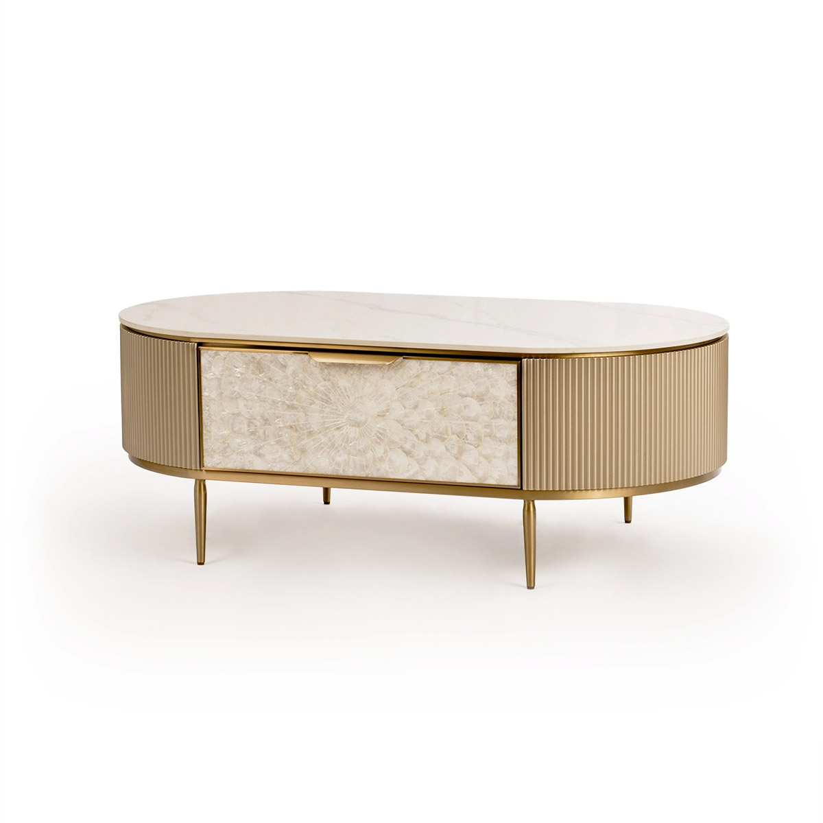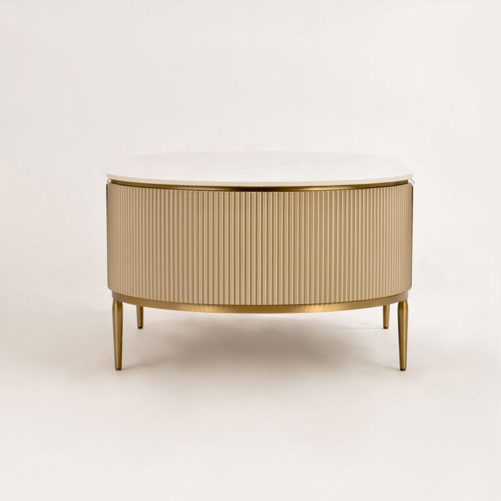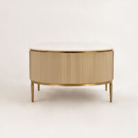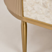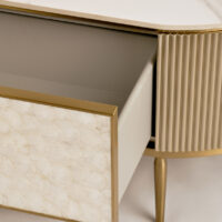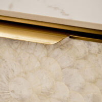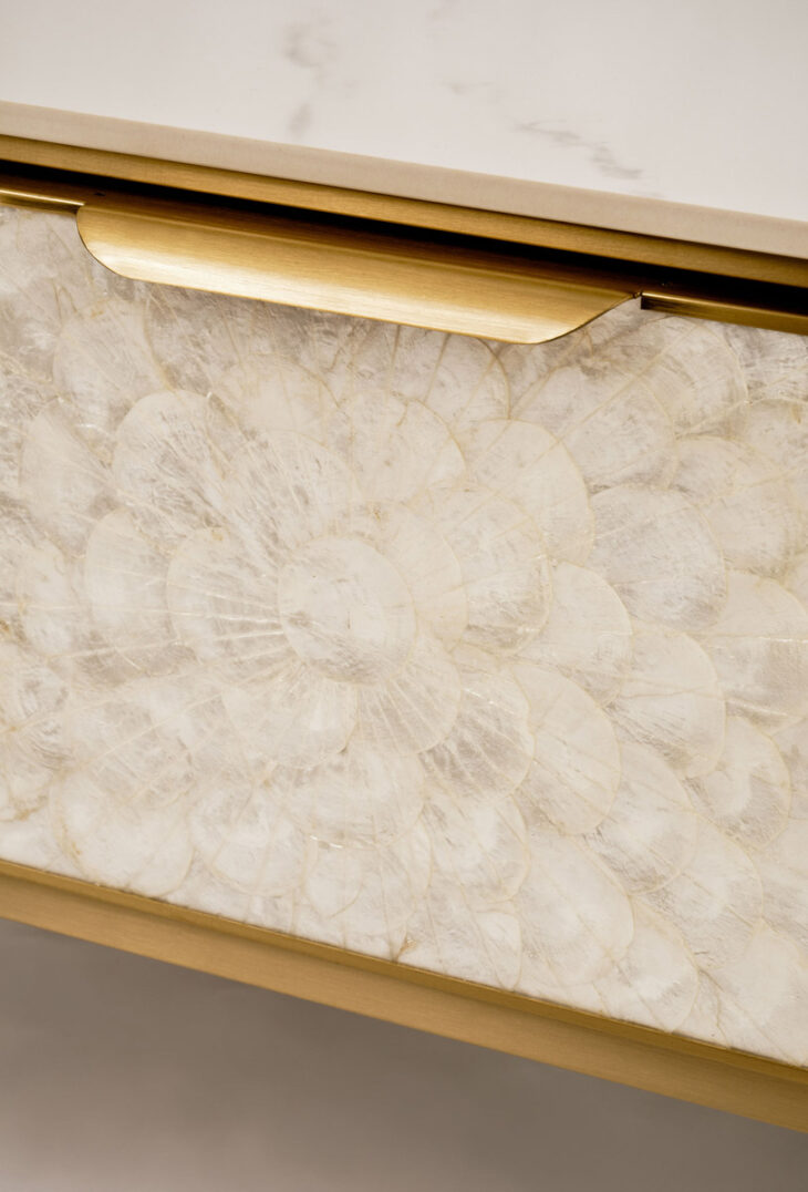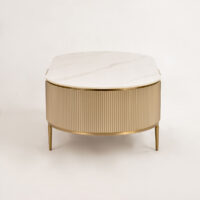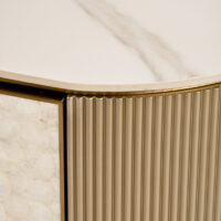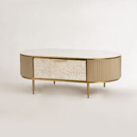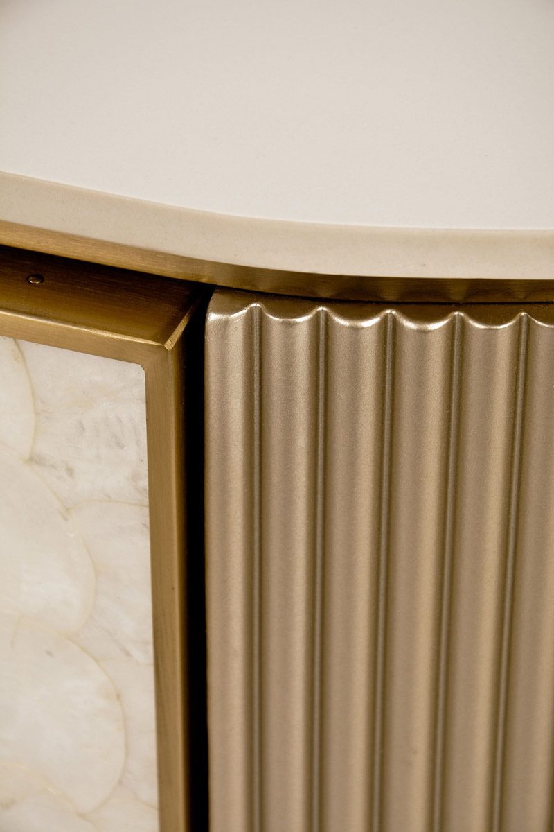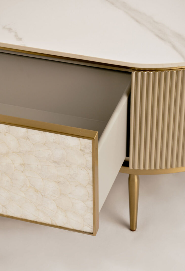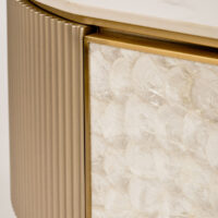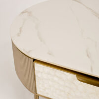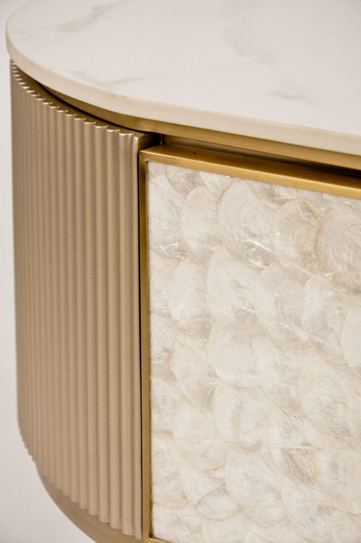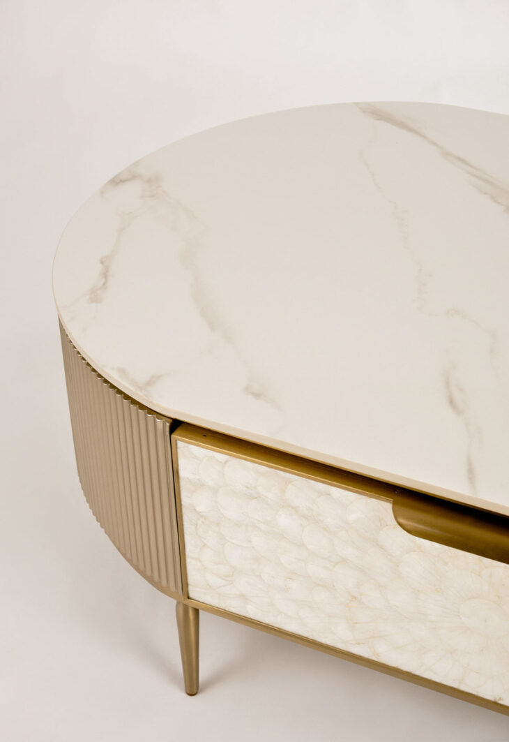 Stolik kawowy Stilig to wyjątkowy mebel, który łączy luksusowy wygląd z artystycznym rzemiosłem. Front z naturalnej muszli morskiej układającej się w promienisty, dekoracyjny wzór przyciąga wzrok i dodaje wnętrzu niepowtarzalnego charakteru. Korpus z ryflowanego drewna w odcieniu szampańskiego złota uzupełniony jest eleganckim, białym blatem z syntetycznego marmuru.
