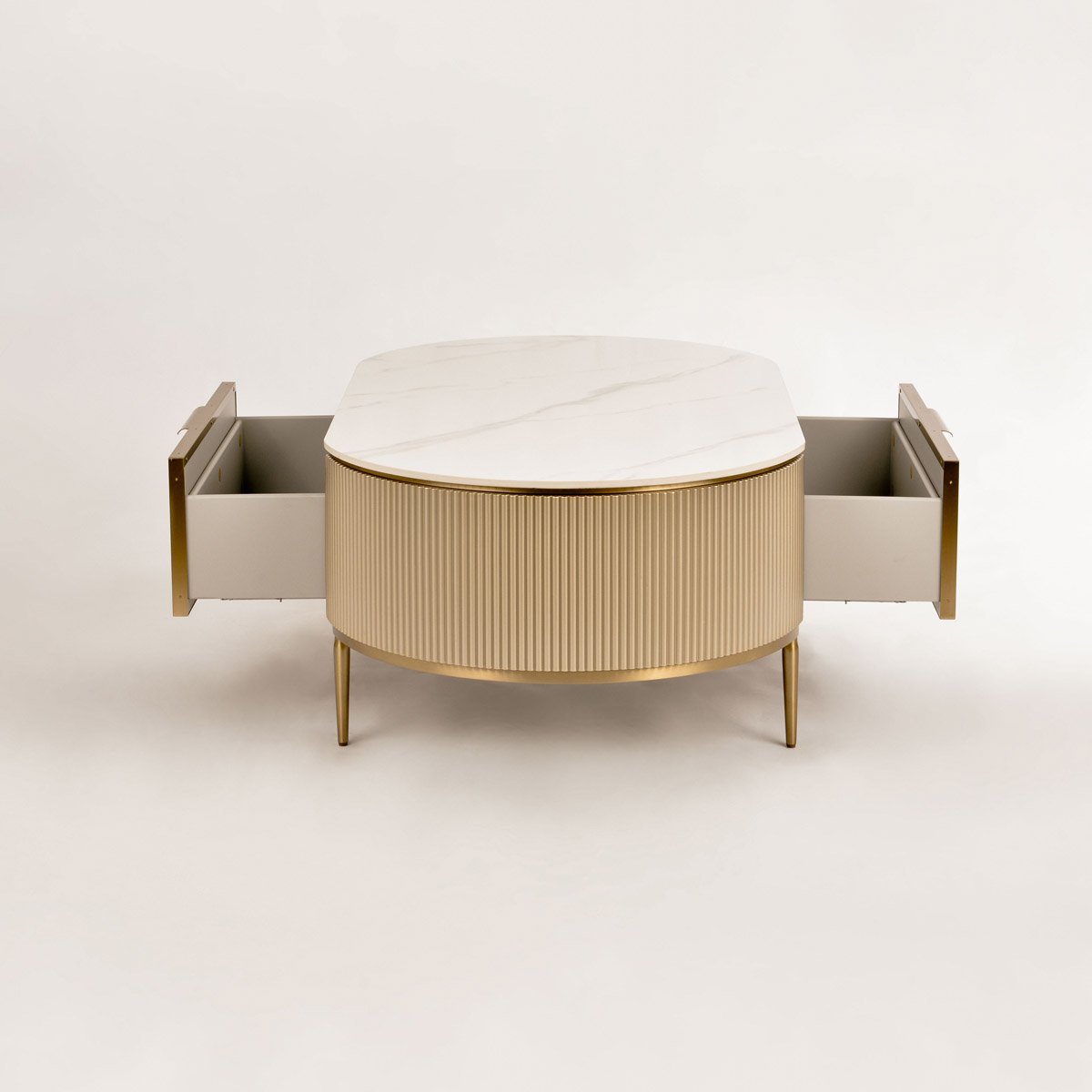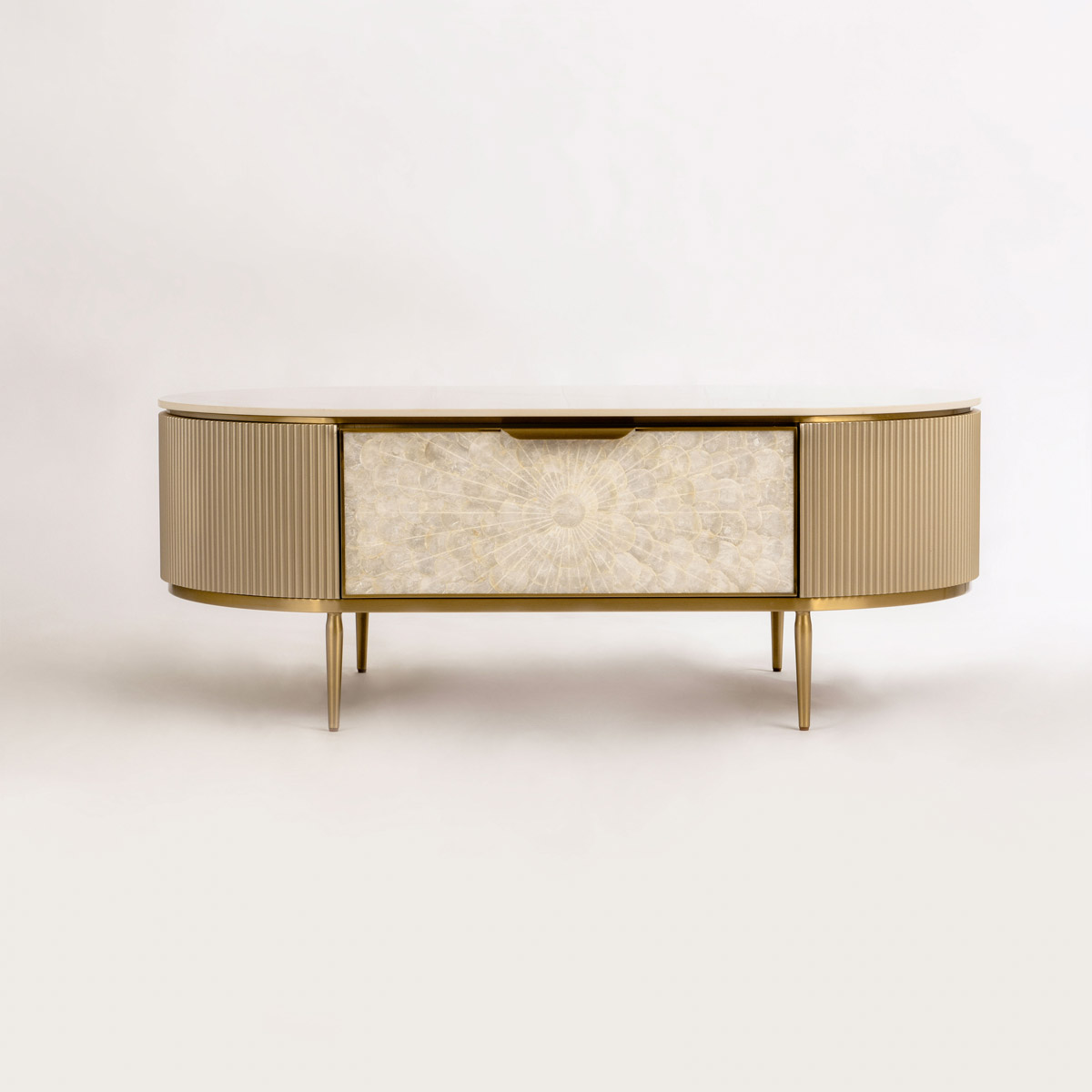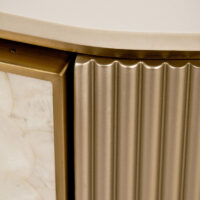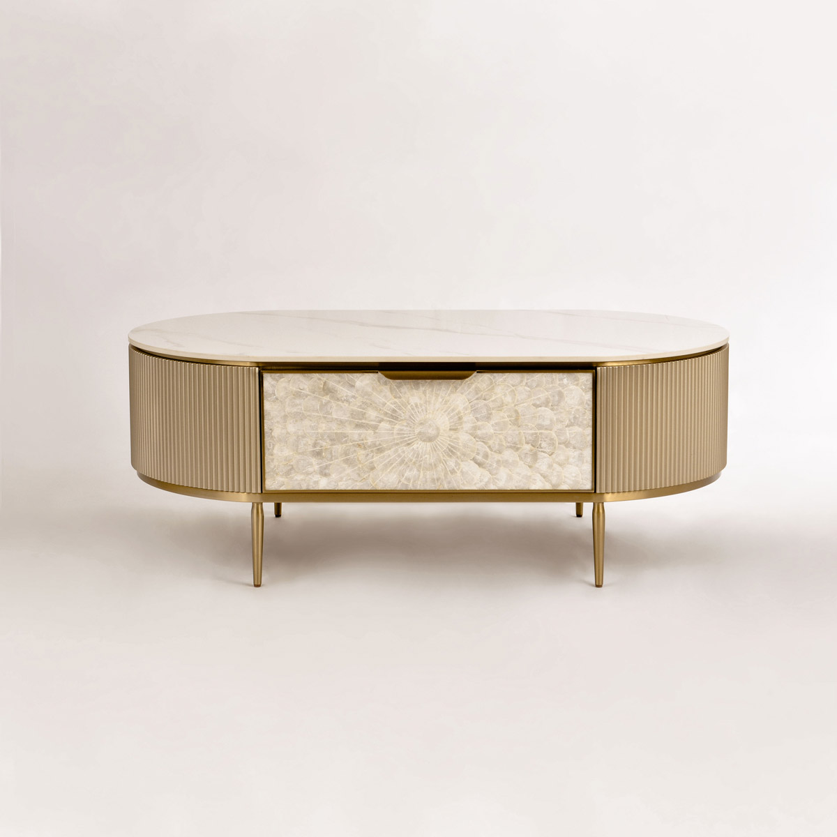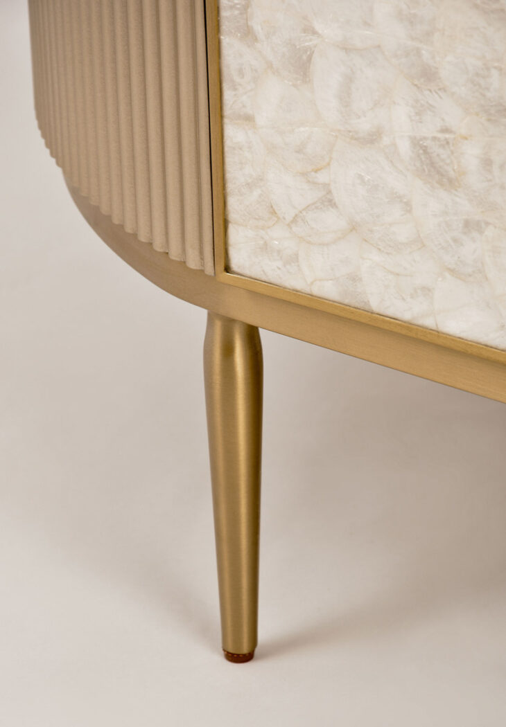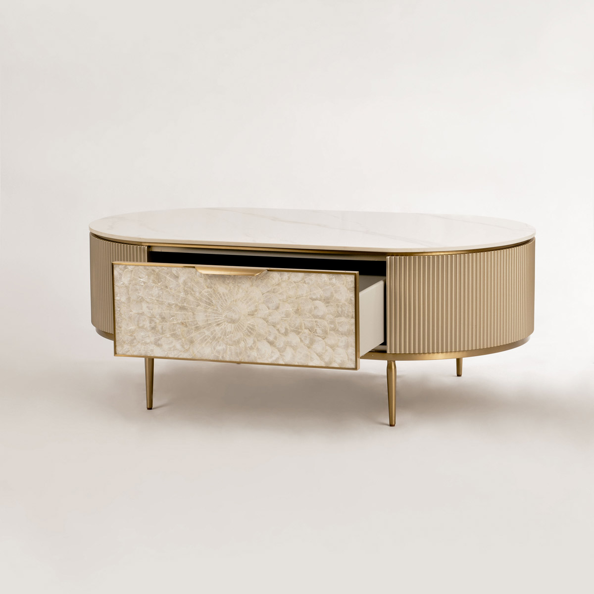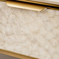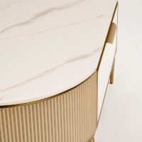 Stolik kawowy Stilig to wyjątkowy mebel, który łączy luksusowy wygląd z artystycznym rzemiosłem. Front z naturalnej muszli morskiej układającej się w promienisty, dekoracyjny wzór przyciąga wzrok i dodaje wnętrzu niepowtarzalnego charakteru. Korpus z ryflowanego drewna w odcieniu szampańskiego złota uzupełniony jest eleganckim, białym blatem z syntetycznego marmuru.