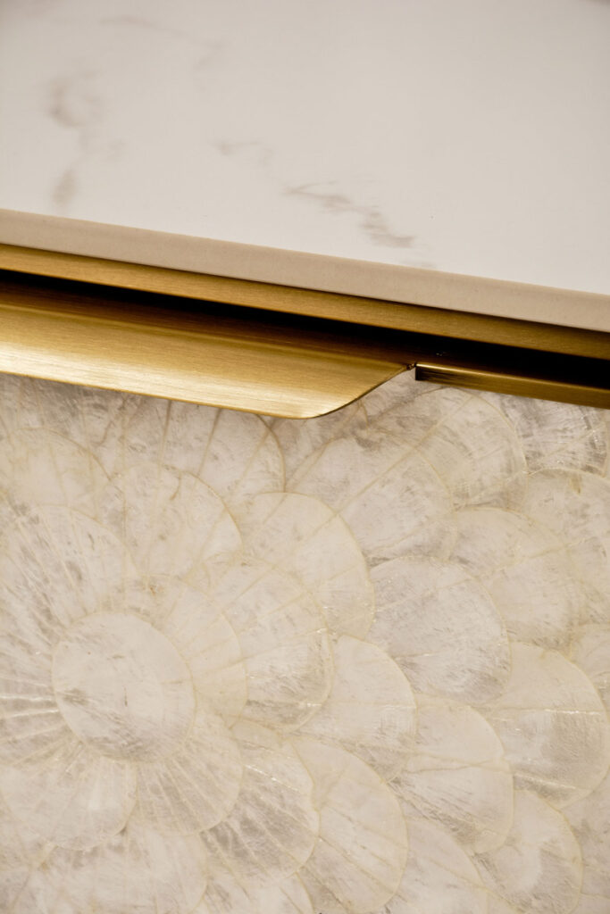 - Materiał: MDF, stal nierdzewna, naturalna muszla morska, blat z marmuru syntetycznego