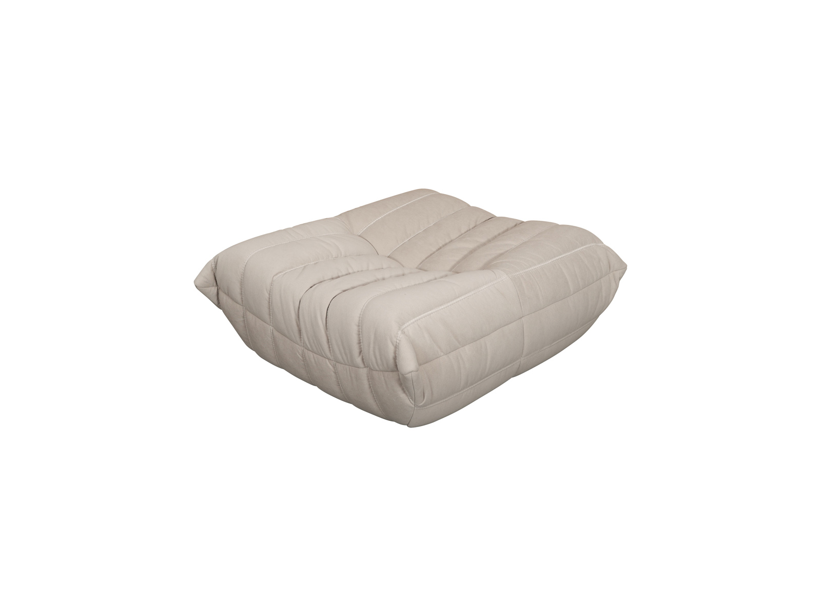 Nowoczesna, ikonowa sofa dwuosobowa o prostym kształcie i detalach w postaci poziomego przeszycia z pikowaną środkową pionową linią, w kolorze beżowym w zestawie z podnóżkiem.